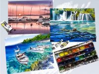 вы напишете акварелью три пейзажа: розовый закат, бурлящий водопад и лодки у скалистого берега.
