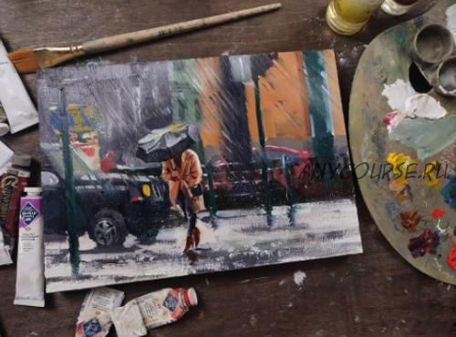 Это небольшой курс для тех, кто уже умеет работать маслом. На занятиях вы научитесь писать этюды, главным героем которых будет дождь.