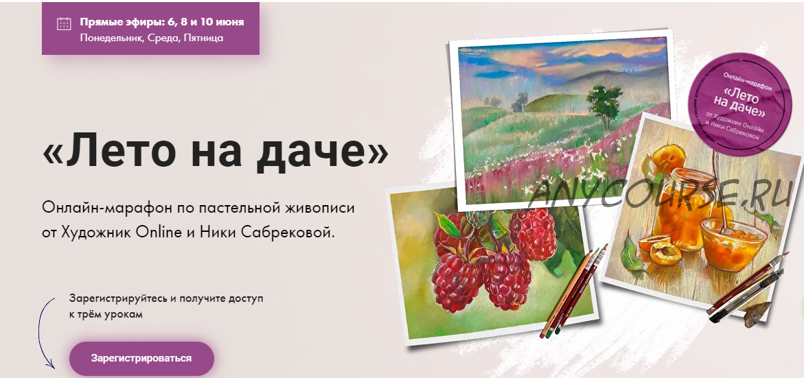 С 6 по 10 июня преподаватель проведет прямые эфиры, во время которых расскажет о создании пейзажей и натюрмортов и ответит на вопросы учеников. Сухой пастелью мы напишем 3 картины — спелые ягоды малины, покрытые цветами поля и баночку абрикосового варенья на столе.