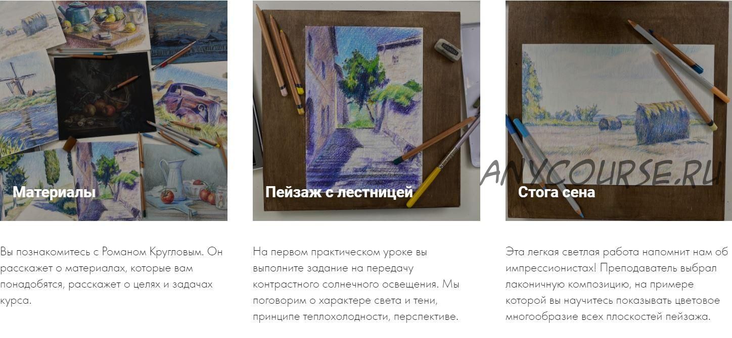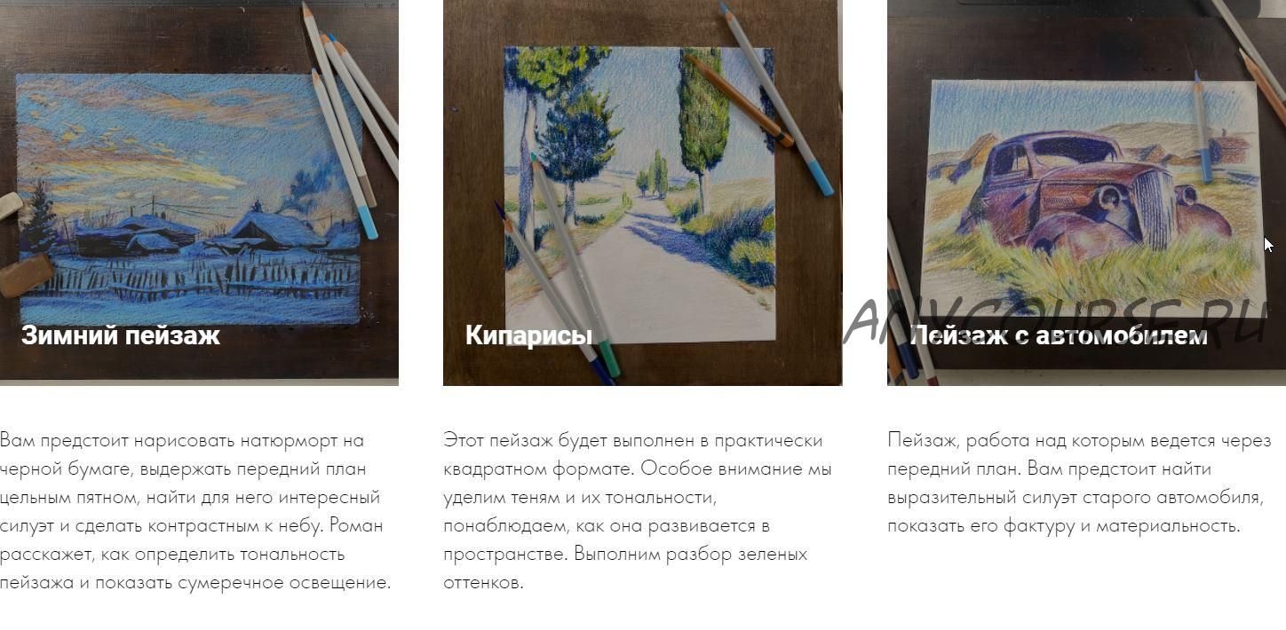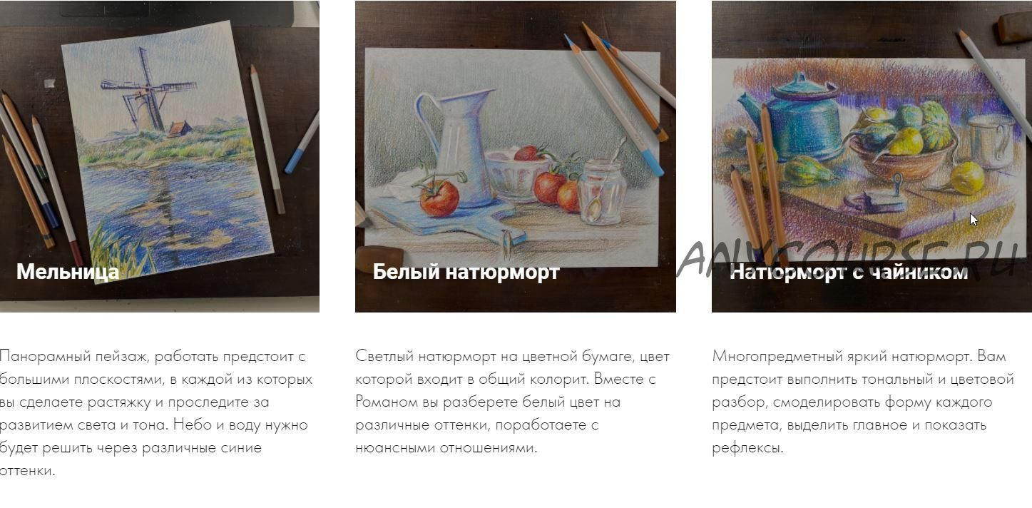 Под наблюдением преподавателя вы будете рисовать многопредметные натюрморты и пейзажи с несколькими пространственными планами. Всего на курсе вы создадите 9 работ! Вы научитесь выделять главное, расставлять акценты и управлять вниманием зрителя, работать с тоном и передавать разные фактуры. Поймете, как максимально использовать возможности цветных карандашей и увидите, как смешиваются друг с другом разные пигменты.