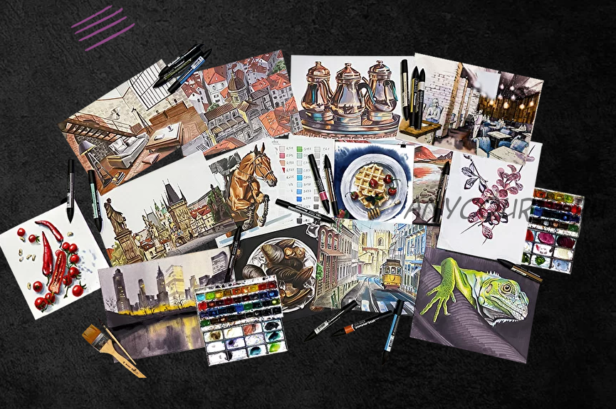 Освойте возможности акварельного скетчинга и скетчинга спиртовыми маркерами на уроках Дарьи Куцаевой и Анастасии Брагиной! Познакомьтесь с основными современными направлениями: food-скетчингом, travel-скетчингом, архитектурным, предметным и ботаническим скетчингом, анималистикой и изображением людей.