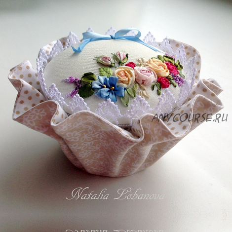• научитесь вышивать лентами миниатюру, используя приемы вышивки 'Рококо' и сборные цветы из узкой ленты;