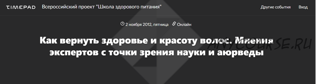 Запись онлайн выступления, в котором приведены древние знания Аюрведы и исследования современных ученых, направленные на восстановление красоты волос. Практические рекомендации от специалистов. Сборник рецептов блюд Аюрведы.