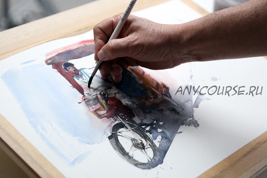 На уроках онлайн-практикума мы выполняем зарисовки людей по мотивам пакистанских сюжетов: нашими героями становятся велорикша, продавец фруктов и колоритный прохожий. Работаем акварелью по-сырому и по-сухому, выбираем технику в зависимости от композиции. Учимся останавливать момент «здесь и сейчас», передаем эмоции своих героев.