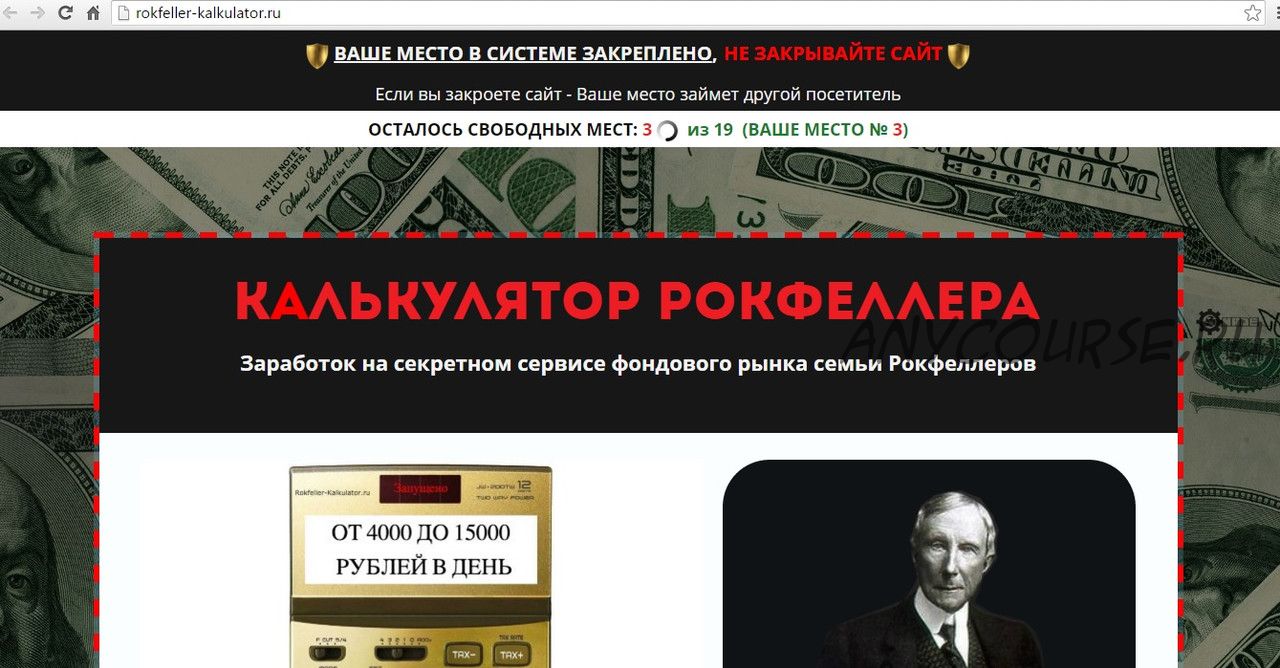 Вы уже слышали из видео, как я нашел этот секретный сервис фондового центра семьи Рокфеллеров, который платит просто за прочтение специальных писем, так же можно просматривать видео и получать неплохие бонусы..так вот поле этого я поехал в США, что бы заработать еще больше в долларах, затем я остался там на 7 месяцев, снял офис, набрал команду и даже познакомился лично с Волтером Гриином Рокфеллером (Владельцем фондового рынка ценных бумаг и потомка Джона Дэвиса Рокфеллера), управляющие менеджеры сервиса предложили мне вывести сервис на Российский рынок, но при условии что количество мест будет ограничено. Вернувшись в Россию я сделал данный сайт для того, что бы несколько счастливчиков могли присоединиться к нашей команде и начать зарабатывать прямо сейчас! Присоединяйтесь к системе, Ваше место ждет Вас, знаю что вы много раз попадались на различные курсы пустышки, система калькулятор рокфеллера полностью изменит Ваше представление об интернет-заработке навсегда!