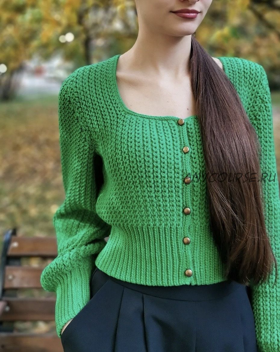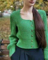 ? Универсальная модель кардигана. Выполнен в технике поперечного вязания крючком. Можно связать несколько вариантов кардигана: укороченный (он на фото), классический вариант (ниже линии талии), а также длинный вариант (ниже линии бедер). Также связать такую модель кардигана можно из любой пряжи и на любой сезон.