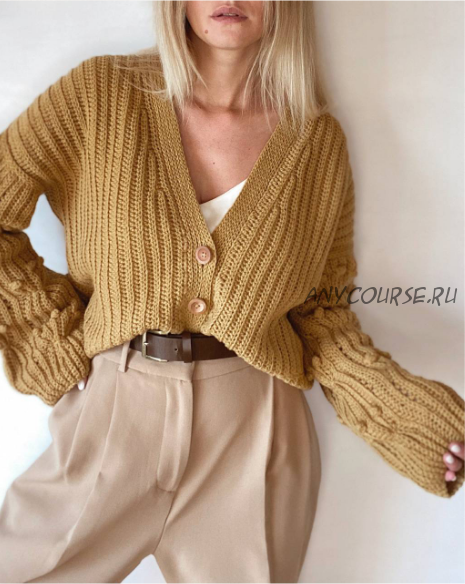 ? Изделие вяжется поперёк. Состоит из отдельных деталей: правая передняя полочка, левая передняя полочка , задняя полочка, рукава. Свободная посадка, спущенный рукав. Вывязываем росток и плечевые скосы. Делаем декоративные наружные швы, которые добавляют игривости. V- образный вырез горловины. С пуговицами. Кардиган лаконичный, но со своей изюминкой - с акцентом на рукавах.