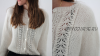 Тело и рукава вяжутся лицевой гладью с ажурным узором по обеим полочкам. Плечи формируются несколькими укороченными рядами с прибавками. Затем вяжется кокетка с прибавками реглана для тела и рукавов, до конца пройм. После завершения этой секции петли рукавов снимаются на удержание, а тело вяжется единой деталью. Затем каждый рукав вяжется по кругу от проймы до манжеты.