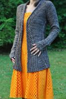 Кардиган связан из довольно тонкой пряжи изнаночной гладью от воротника вниз.