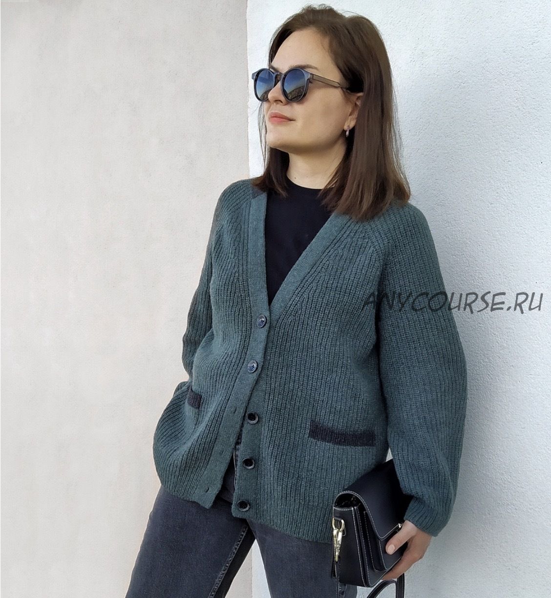 ? Конструкция кардигана: по кругу (без швов) вяжутся рукава до подрезов, далее основная часть кардигана одной деталью снизу вверх до подрезов, все детали соединяются, одной деталью вяжется верхняя часть (кокетка), оформляются карманы, сшиваются подрезы..