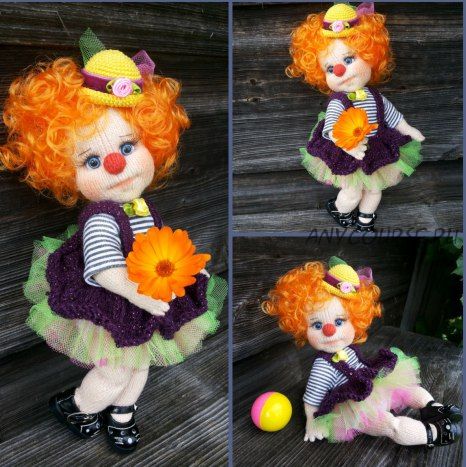 Куколка получается 26 см стоя, на проволочном каркасе, но можно использовать и маленький кукольный скелет, он идеально подходит. Клоунесса принимает любое положение тела. Вяжется одной целой частью спицами. В МК входит описание изготовления одежды.