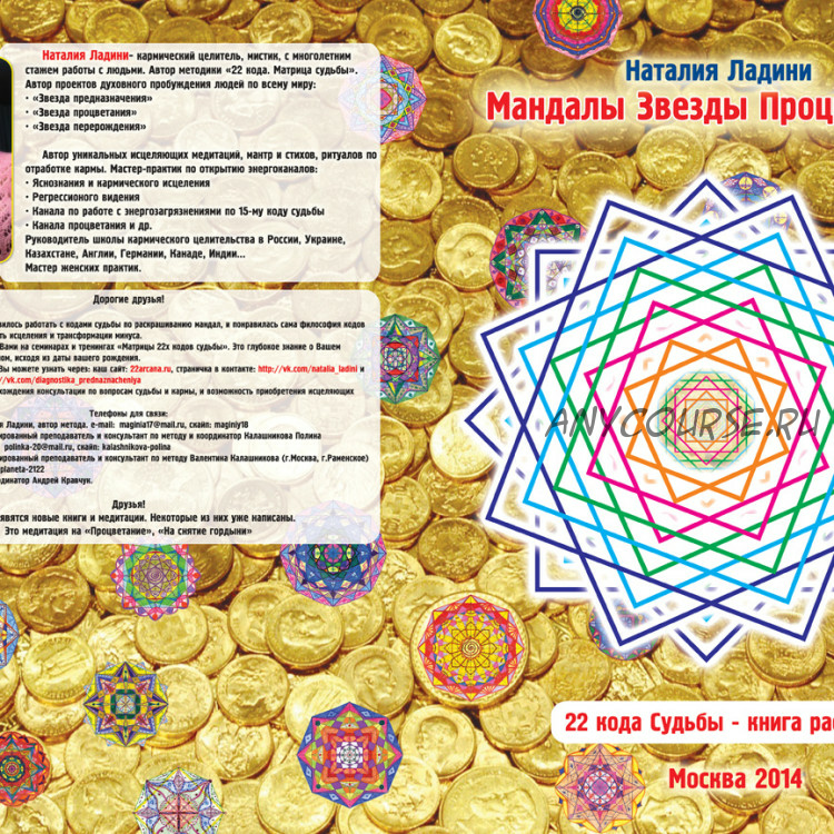 Эта книга — раскраска уникальна тем, что в ней собраны 22 мандалы по энергиям процветания и увеличения денежного потока. С этими мандалами следует работать при проработке в Методе линии Земли и кармы » Денежного обладания». Она раскрывает в человеке творческой — денежный канал, и создана в энергиях Нового времени, в энергиях » Звезды процветания», после нашей экспедиции в Тибет , к горе Кайлас, в 2013 году.