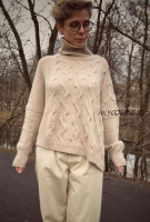 Cвитер связан в одном размере с большим запасом свободного облегания . Ширина тела 68см. Связан из пряжи biagioli modesto 100% кашемир 350м/100гр . Потребуется 450гр. Свитер имеет асимметричный нижний край. Но может быть и прямым. Это регулируется плотностью вязания . Основные спицы 4,0 . Свитер связан без швов. Сверху вниз. Плечевые швы смещены назад. Спущенное плечо . Горловина оформлена имитацией пришивной горловины .