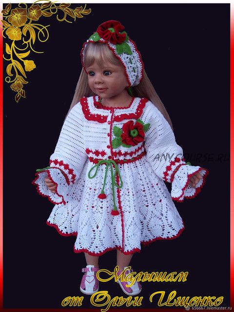 В мастер-класс входит 107 страниц,состоит из пошаговых фото.описания и схем.В Мастер-класс входит 4 части,формат word по желанию возможен формат PDF.Ниточки СОСО vita 100% мерсеризованный хлопок,крючок кловер 2.Расчет на 2-2,5 года,но если нужно помогу с расчетом на больший размер.