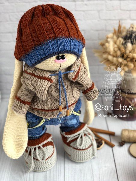 Включает в себя около 70 фотографий и пошаговое описание пяти элементов одежды (шапка бини, футболка с рисунком, пуловер со съемным воротником, рваные джинсы, кеды) для 40-сантиметрового зайчика.
