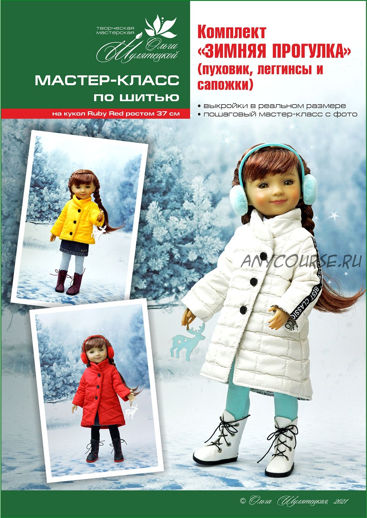 Мастер-класс в электронном формате (PDF-файл) на 14 страницах А4 содержит пошаговые инструкции по шитью комплекта «Зимняя прогулка» на кукол Руби Ред ростом 37 см. В мастер-класс входят выкройки в реальном размере, фотографии этапов шитья, пошаговые инструкции и рекомендации (материалы, раскрой, порядок работы).