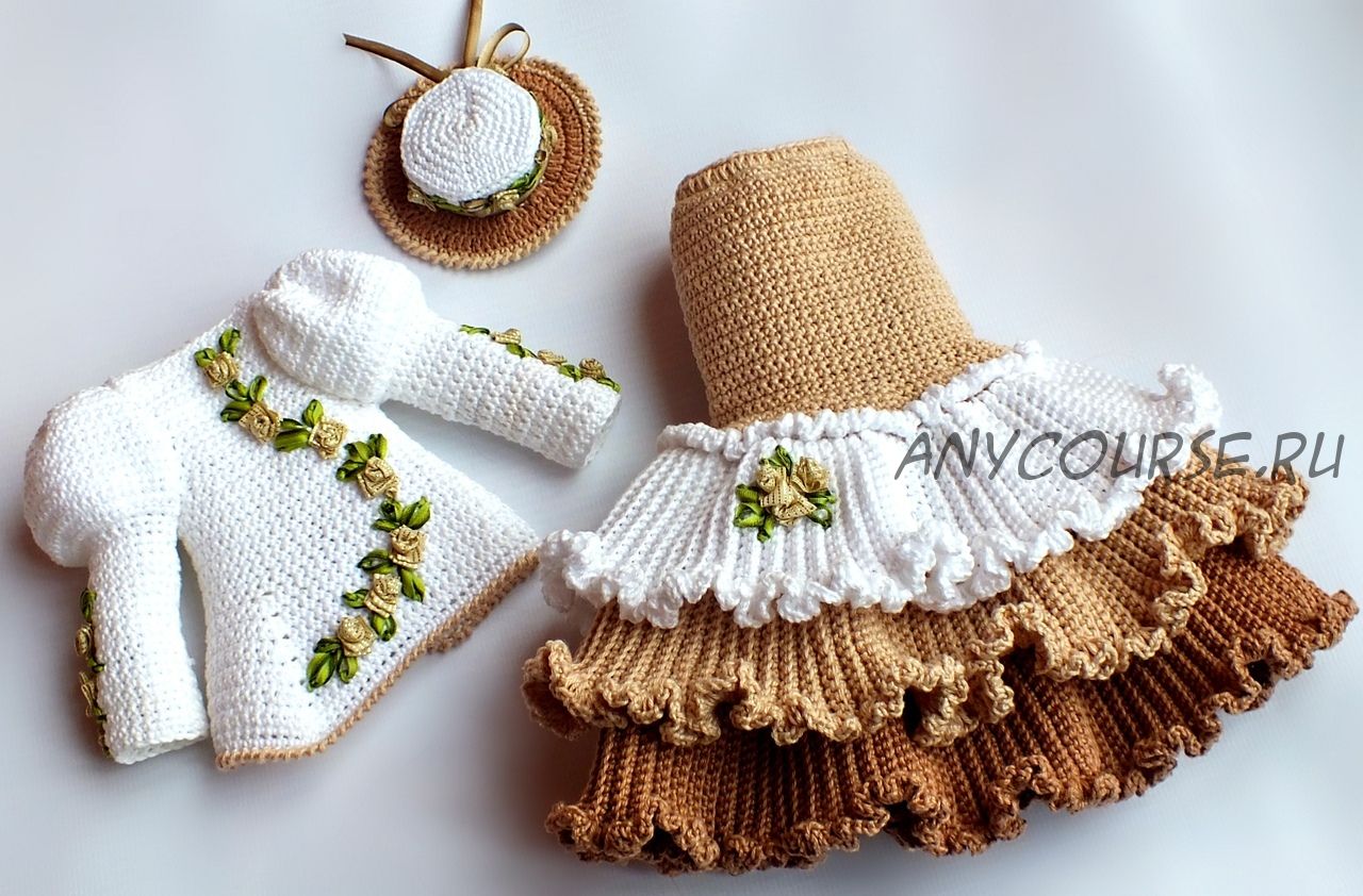Комплект одежды (юбка, блуза, шляпка). Связано крючком. УУкрашено вышивкой лентами