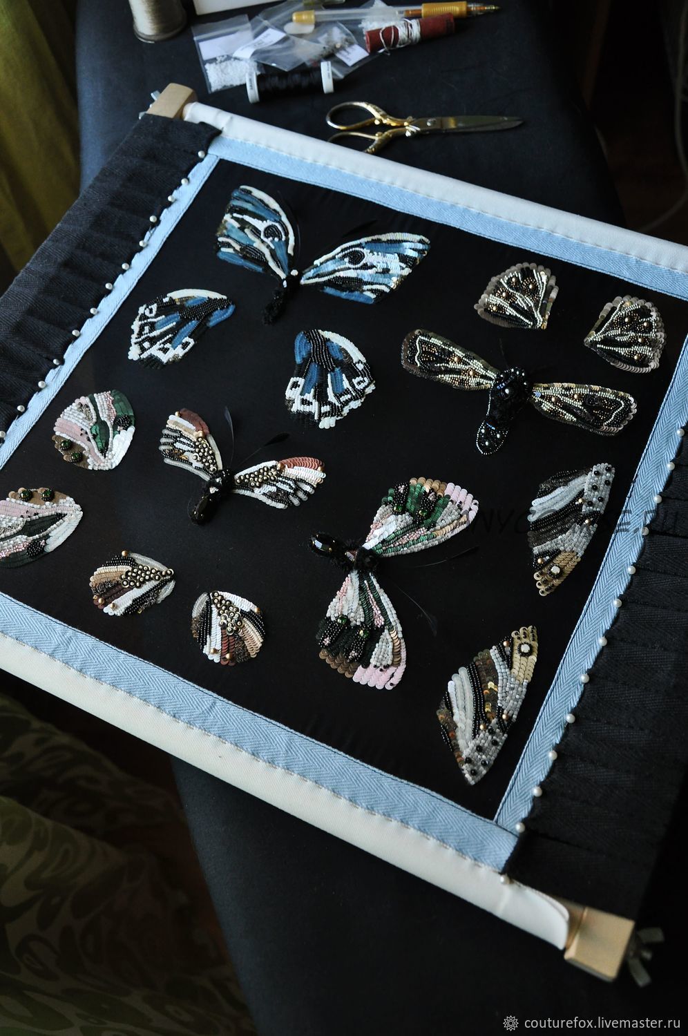 Процесс сборки и обработки не показан, только вышивка.