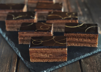 Бисквит с темным шоколадом, абрикосовое конфи с кислинкой маракуйи, легкий шоколадный мусс и черная зеркальная глазурь с какао.
