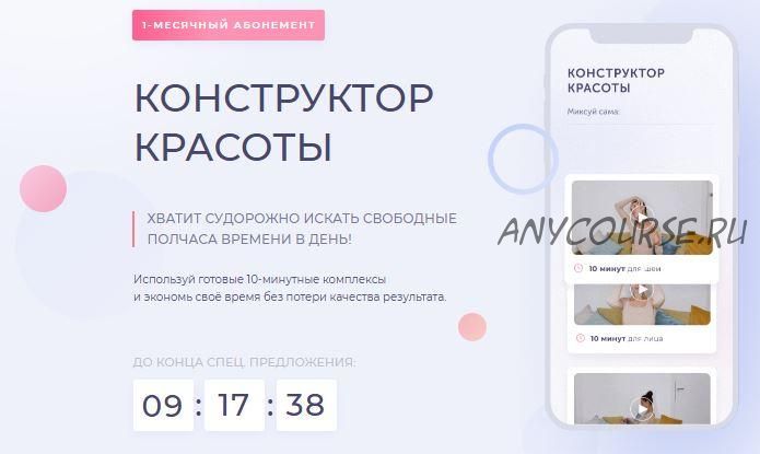 Конструктор красоты - это онлайн-тренажер для лица и тела, где комплексы разбиты на короткие десятиминутные комплексы и позволяют НЕ выделять специального времени на занятия. Используй готовые 10- 15 минутные комплексы и экономь сове время без потери качества результата