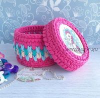 подробный показ всех этапов вязания: -обвязка деревянного донышка 15см. -переход к стенкам -узор с вытянутыми петлями -смена цвета -бесшовное соединение -вязание крышки на основе деревянного донышка -о ВТО изделия