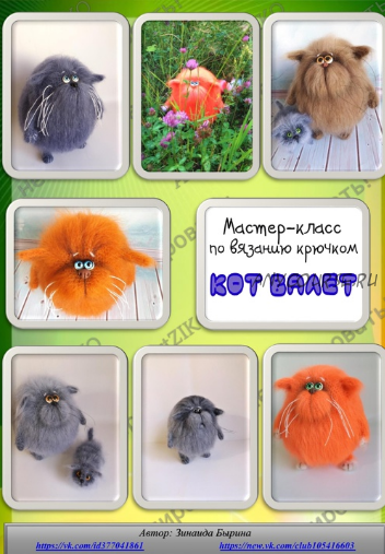 Мастер-Класс по вязанию крючком 'Кот Валет' представлен в красочном оформлении на 41 странице и более 50 фото этапов вязания. Уровень сложности - средний,при наличии навыков вязания крючком,справится начинающая рукодельница.В МК представлены ссылки на 3 видеоурока в пяти видеороликах : Набивка,начесывание,тонировка Кота. Кота Вы можете связать в 2-х вариантах: на каркасе и без каркаса.
