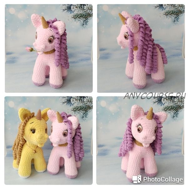 Мастер-класс на единорожку 'Кудряшка Сью'. Формат pdf. Очень понятное и подробное описание на 29 страницах, имеет 80 пошаговых фото. Рост от 24 см (смотря каким крючком).