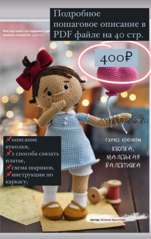 Вы получите: запись онлайна по вязанию валентинок. Схема включает в себя инструкцию для куклы и ее двух воздушных шаров. Эта схема вязания крючком поможет вам сделать амигуруми вязаную крючком симпатичную куклу с воздушными шарами в форме сердца.