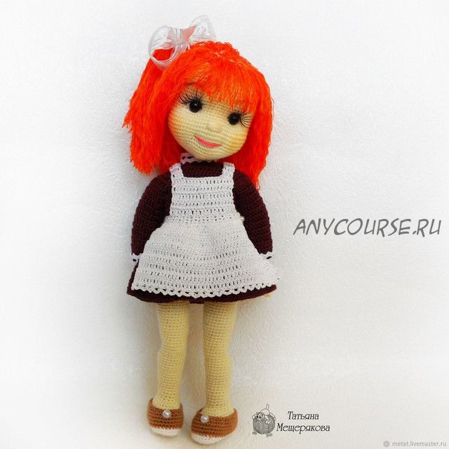 Мастер-класс по вязанию каркасной куклы-первоклассницы. Ноги-туловище связаны одной деталью, руки ввязаны, голова пришита. Готовая кукла самостоятельно стоит неуверенно (может стоять, если в стопы положить металлический гранулят). Данный мастер-класс содержит описание вязания куклы,одежды, показаны утяжки, оформление лица. В описании ОТСУТСТВУЕТ способ прикрепления волос. МК рассчитан на рукодельниц с опытом вязания кукол.