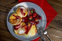 • Сырники из рикоты с двумя видами соусов: бананово-карамельный соус и малиновый кули