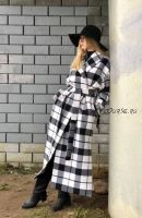 Пальто-халат прямого силуэта, распашное, со съемным поясом, на притачной подкладке (можно без). По центру спинки застрачивается встречная глубокая складка (не обязательно). Рукав одношовный, рубашечного покроя со спущенным плечом. Воротник шалевого типа с широким отлётом. В боковых швах карманы и разрезы от низа. Отделка: декоративная нагрудная листочка на левой части переда, в нижний шов рукавов притачиваются паты/ленты на 10 см от низа.