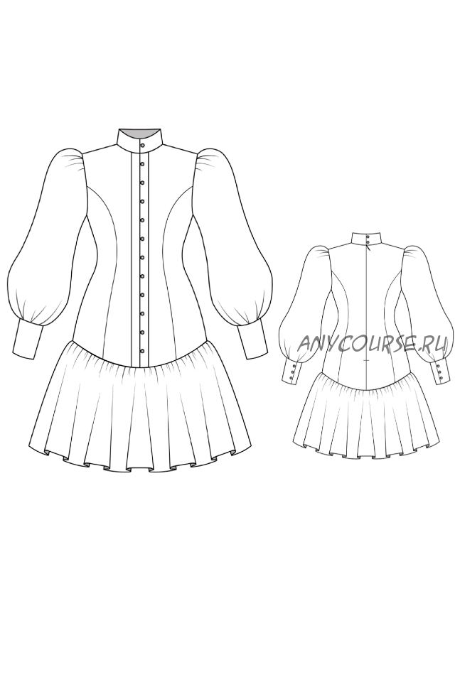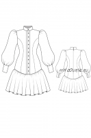 Юбка-рюш шириной около 30 см. Воротник стойка. Застежка на потайную тесьму молнию в среднем шве спинки. По центру переда декоративная планка с пуговицами и воздушными петлями (не расстегивается). При пошиве из шитья/кружева детали переда и спинки дублируются подкладкой полностью.