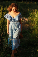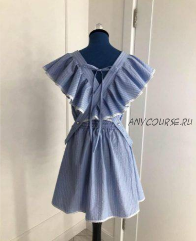 Сарафан прилегающего силуэта, отрезной по линии талии, длиной ниже колен. Лиф на отрезной талиевой кокетке. Кокетка и перед лифа обтачиваются подкладкой. Перед со сборкой на груди по линии притачивания кокетки. Центральная часть спинки с 9-10 рядами эластичной тесьмы в расстроченных кулисах. Бретели лифа пристегиваются на пуговицу на уровне талии спинки. По всей длине бретелей притачан волан со сборкой или складками. Юбка клеш со сборкой по линии талии, с настрочной оборкой по низу, шириной 25-27 см.