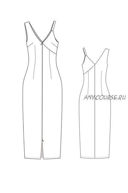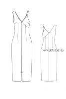 Сарафан женский прилегающего силуэта, длиной до середины голени. Застежка по центру переда на разъемную двухзамковую молнию. Верх сарафана представлен в двух варианта – цельнокроеный с широкой бретелью (маечка) и отрезной под грудью на тонкой бретели. Сарафан может быть исполнен с асимметричным верхом или с любым симметричным вариантом. Прилегание обеспечивается за счет вытачек талии, боковых и среднего шва спинки. Верхняя часть лифа обрабатывается обтачкой «маечка», отрезной лиф полностью дублируется подкладкой/батистом. При необходимости полную подкладку изделия можно выкроить по лекалам верха.
