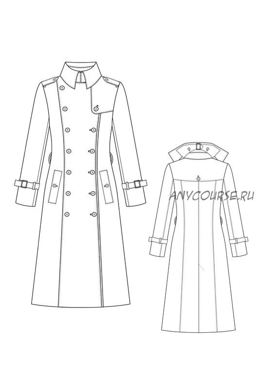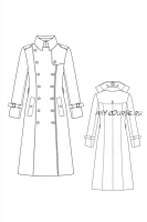 ? Плащ женский прилегающего силуэта, длиной ниже колен, с поясом, с притачной подкладкой. Перед со смещенной (двубортной) застежкой на 8 петель и пуговиц (+8 пуговиц второй ряд), с вертикальными рельефными швами из плечевого шва до низа, с отлетной нагрудной кокеткой на левой части переда, с боковыми прорезными карманами с настрочной листочкой и застежкой на 1 петлю и 1 пуговицу. Спинка со средним швом и шлицей в нем, с вертикальными рельефными швами из плечевого шва до низа, с отлетной плечевой кокеткой с декоративной пуговицей. Рукав втачной двухшовный, с декоративными съемными патами и шлевками внизу рукава, на патах 2 пряжки ш.30мм. Воротник стояче-отложной с отрезной стойкой и широким отлетом, с декоративной съемной патой на нижнем воротнике на 2петлях и 2 пуговицах, на пате пряжка ш.30мм. На плечах съемные паты-погоны на 1 петле и 1 пуговице, под шлевкой. Пояс съемный, на шлевках в бок.швах, с пряжкой ш.50мм. Отделочные строчки шш.0,5см проложены по краю борта, отлету и стойке воротника, рельефным швам, локтевому шву рукава, патам, краям кокеток и поясу.