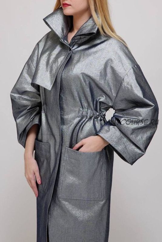 Выкройка плаща «оversize» на притачной подкладке, с объемным рукавом и кулисой по талии. Перед с отлетной кокеткой справа, с накладными карманами, с центральной бортовой застежкой на 5 пришивных кнопок. Спинка без среднего шва. Рукав рубашечный одношовный, с четырьмя глубокими складками-защипами по нижнему шву, с обтачкой по низу. Воротник стояче-отложной двухслойный. Талиевая кулиса затягивается лентами на спинке. Отделочные строчки по всем обтачанным срезам.