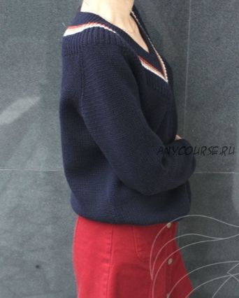 Свитер вяжется снизу вверх по кругу без отрыва нити, рукава соединяются с телом в проймах и вяжутся вместе до высоты плеч, дальше по кругу вяжется декоративная резинка.