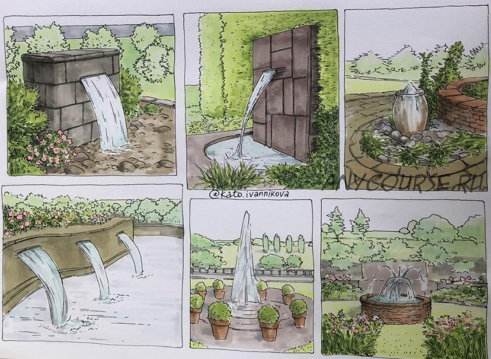 Садовые каскадные водопады, ручьи, прудики. Водные растения.