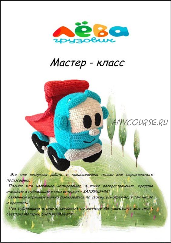 Мастер-класс по вязанию грузовичка Лёвы состоит из 30 страниц, содержит подробное описание процесса, 80 фотографий пошагового изготовления, сборки деталей и оформления игрушки. Уровень сложности – выше среднего.