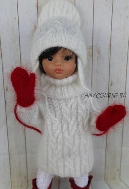 В комплект входят-свитерок-туника с аранами, шапочка с ушками и отворотом с аранами как на свитерке, гамаши с ажурными лампасами и двойными манжетами, варежки.