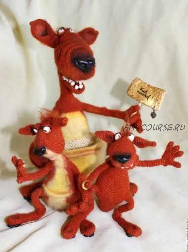Мастер-класс по вязанию трех кенгурят, содержит подробное описание процесса на 54 листах, более 180 фотографий пошагового изготовления, сборки деталей и оформления игрушки. МК включает в себя изготовление частей из пластика и пошива чемоданчика (с выкройкой).