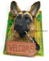 Большая объемная картина, внизу которой располагаются крючки для ключей. В зубах собаки табличка 'Welcome'.