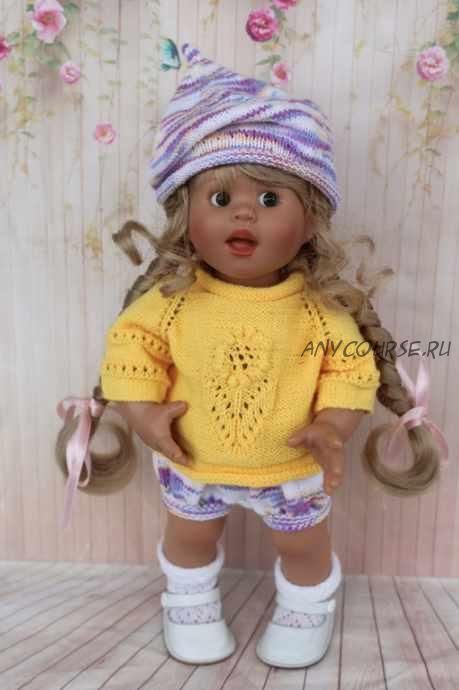 Комплект состоит из свитерка с узором, панталончиков и берета.