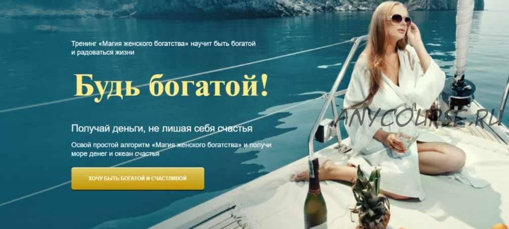 «Магия женского богатства» — это онлайн-тренинг, который включает 3 мощных и необычайно результативных занятия. Он даст тебе эффективные инструменты, которые позволят привлечь в свою жизнь богатство и при этом быть счастливой.