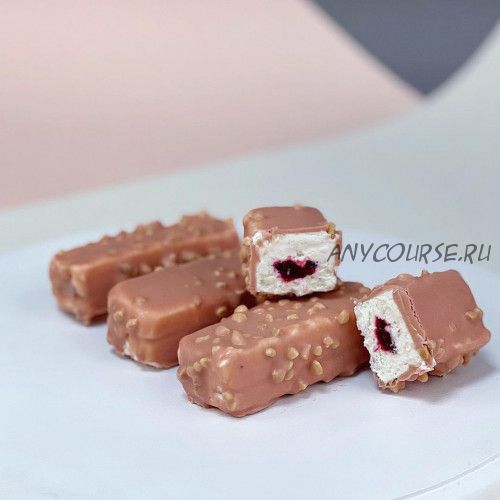 Крем на основе сыра с добавление горгондзолы и кули из маракуйя в начинке. - Батончик 'Малина - кокос' Благородное сочетание нежного, взбитого, кокосового ганаша с ярким кули малины.