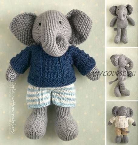 PDF-файл содержит подробные инструкции по вязанию и отделке маленького слона с помощью фактурного свитера и шорт. После оплаты он доступен для немедленной загрузки.