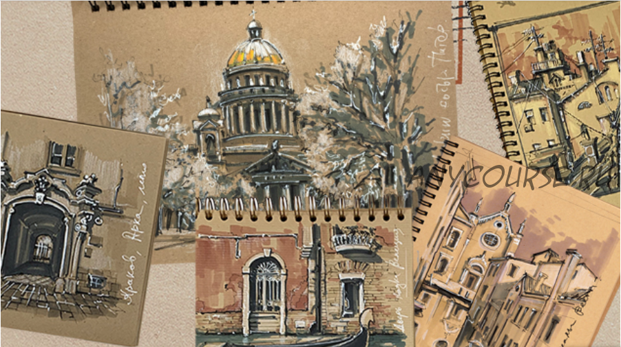 ? Один из самых популярных курсов в нашей школе на тему городского быстрого скетчинга на крафт бумаге. Архитектурный скетчинг на крафте, курс о путешествиях, городской архитектуре, о том, как научиться быстро, эффектно фиксировать сложные городские объекты на бумаге.