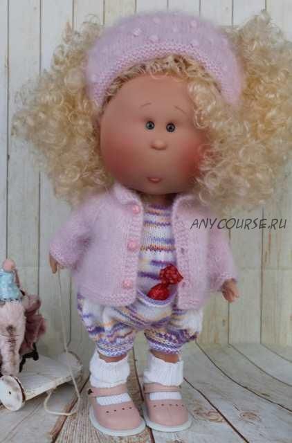 Вы свяжете комплект-песочник с большим карманом, кофточку с узором 'шишечки', распашная с застежкой на пуговках, косынку на любой тип волос куклы, гольфики.
