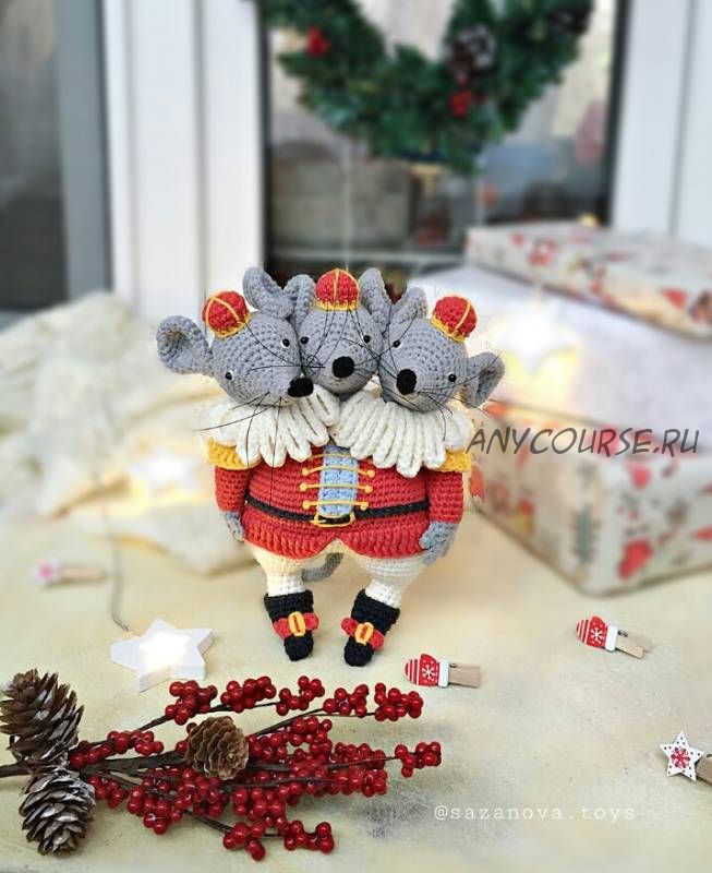 Вязание идёт по спирали. Ноги и тело вяжутся непрерывно. Ручки, мордочка, уши, корона и небольшие элементы декора - пришиваются. Набивайте изделие по ходу вязания, маленькими порциями. Из указанных материалов Мышиный король получается ростом 21 см.