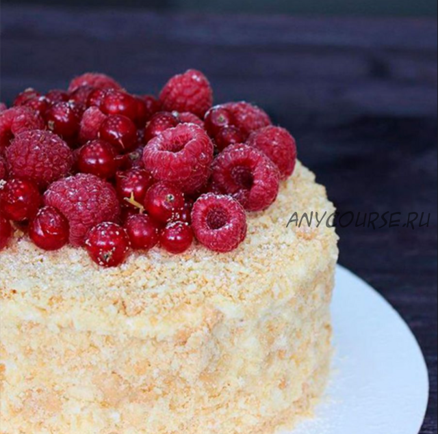 О десерте: много-много тончайших коржей из рубленного теста, нежнейший заварной крем с ванилью и нотками сгущённого молока, а сверху побольше свежей малины или клубники! В целом, торт готовится очень просто и не требует никаких 'сложных ингредиентов', что делает его подходящим для любой хозяйки.
